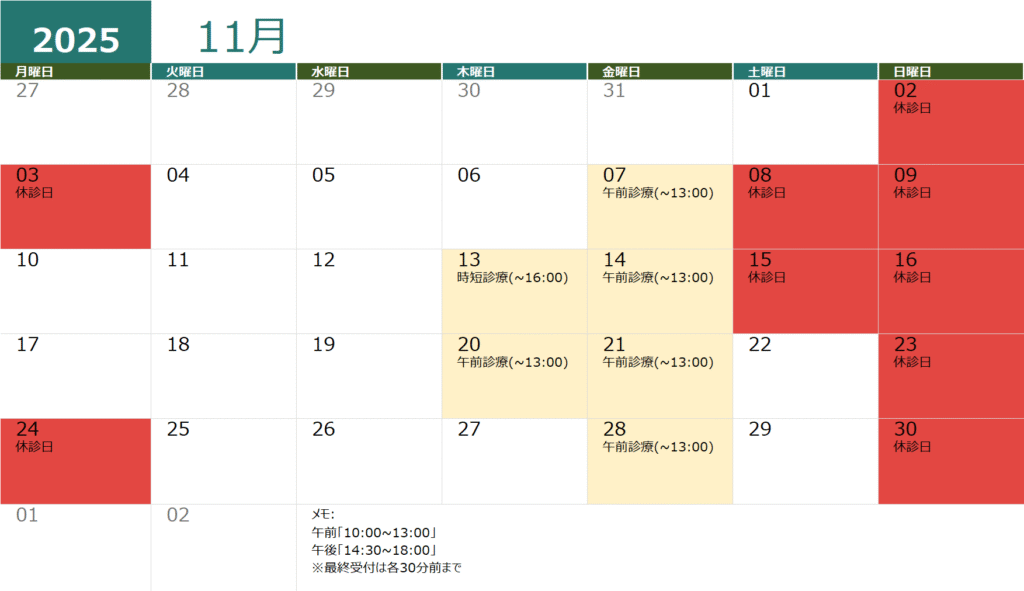 ※休診日 金曜(14:30~18:00)・日曜・祝日(臨時休業はHP等でお知らせします。)