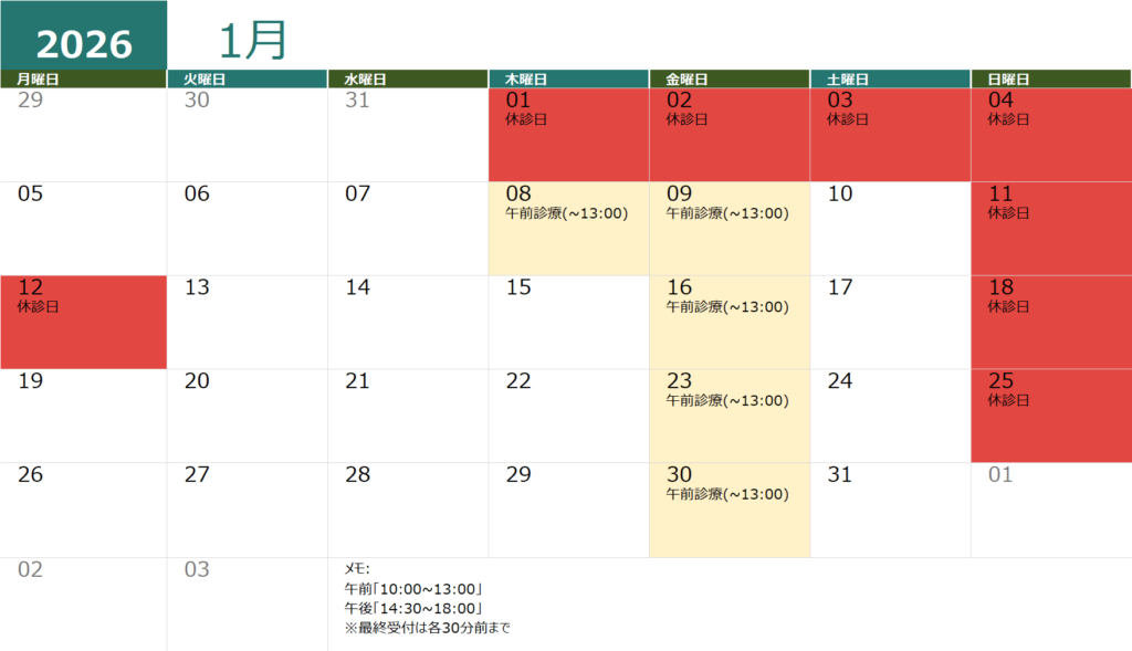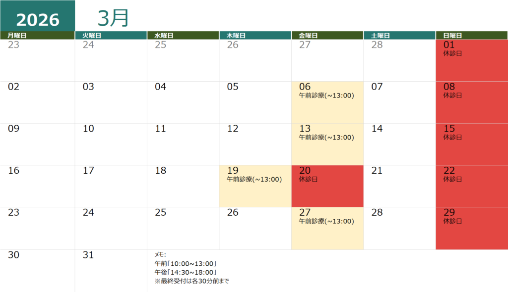 ※休診日 金曜(14:30~18:00)・日曜・祝日(臨時休業はHP等でお知らせします。)